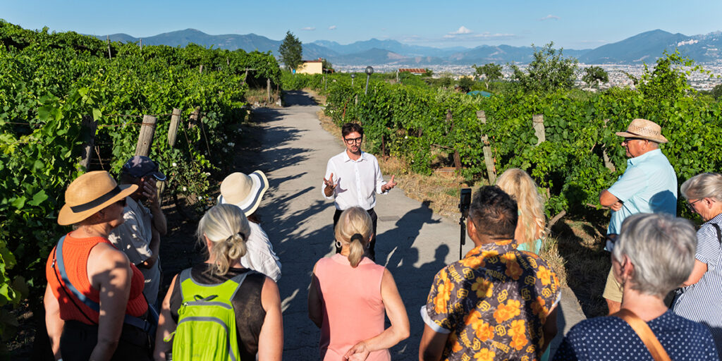 Following the visit, the journey continues to a winery located at the foot of Mount Vesuvius. Here, participants enjoy a cellar visit, a guided wine tasting and lunch, featuring local specialties and wines grown in volcanic soil. In the afternoon, the group returns to Sorrento, with the evening free and dinner at leisure.