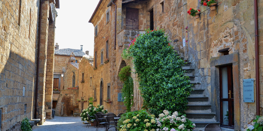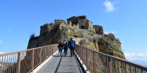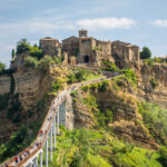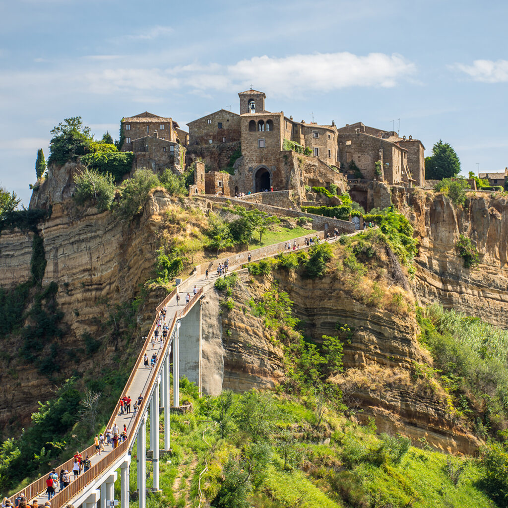 The day begins with a departure from Rome, traveling through the rolling Italian countryside toward Civita di Bagnoregio (approximately 2 hours drive).